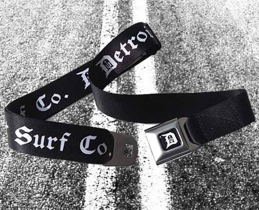 Detroit Surf Co. logo belts made with an authentic automotive retro style SeatBelt buckle, and nylon material. Inspired by the hot rods on the 60′s, and 70′s in the Motor City. Made in USA.