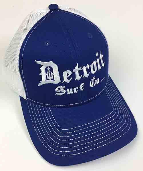 Classic logo mid profile Outdoor Cap 771 Trucker hat with adjustable snap back closure. Royal Blue front with white mesh rear, white embroidered logo, and contrast stitching. One size fits all snapback.