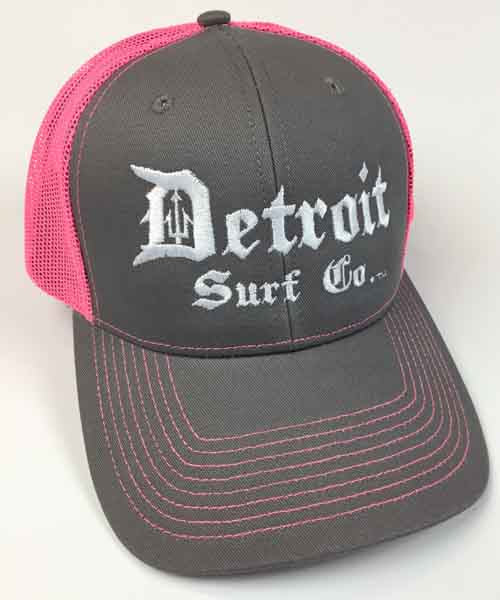 Classic logo mid profile Outdoor Cap 771 Trucker hat with adjustable snap back closure.  Grey front with pink mesh rear, white embroidered logo, and pink contrast stitching.  One size fits all snapback