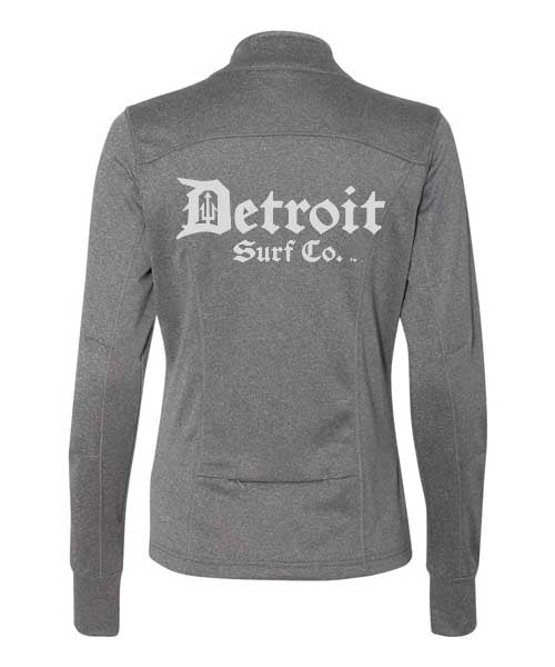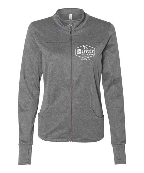 Ladies premium 100% poly fleece logo full zip track jacket with modern athletic fit.  Logos in metallic silver (white logos on metal heather), small left chest, and full rear logo.