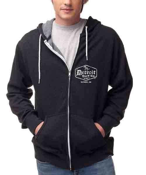 Show your pride! Unisex premium zip up hoodie with a distressed retro surf logo on back, and small logo on front left chest.