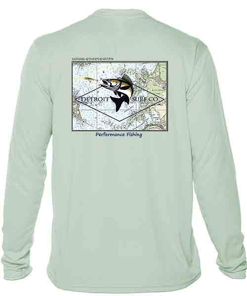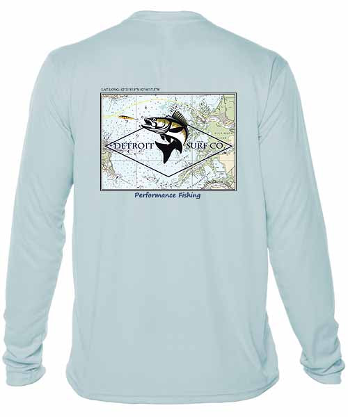 The Back features a navigation chart of Lake St. Clair, and a small logo on front left chest.  All artwork is applied using dye sublimation, so there is no heavy screen printing on the shirt.
