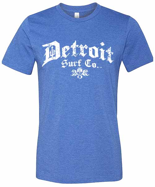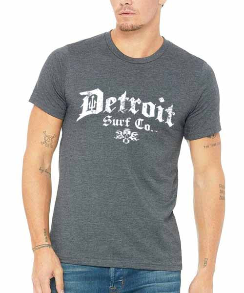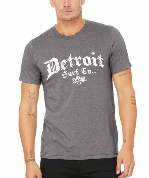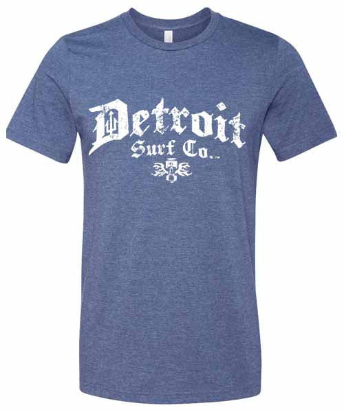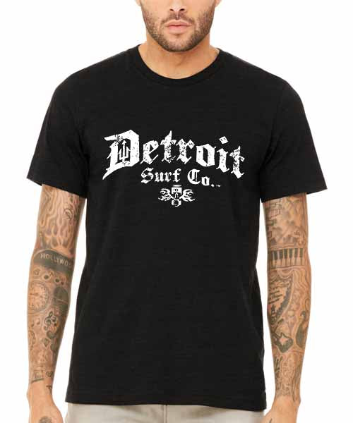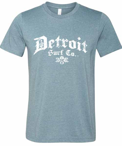 Brand new Detroit Surf Co. flaming piston logo, slightly distressed. We used our original Olde English font with our trident D, and the flaming piston off our new retro surf logo T.