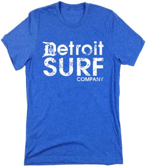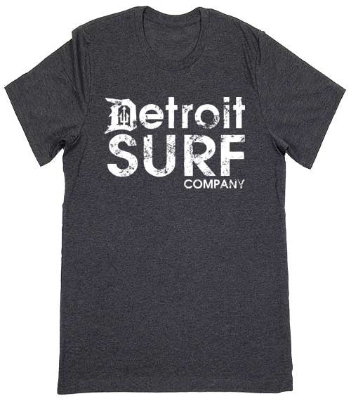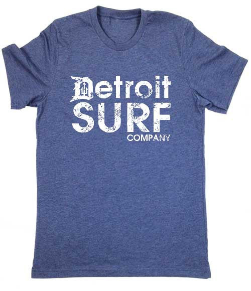 Detroit Surf Company distressed logo on vintage soft premium Tees. Vintage Soft 4.2 oz cotton poly blend.