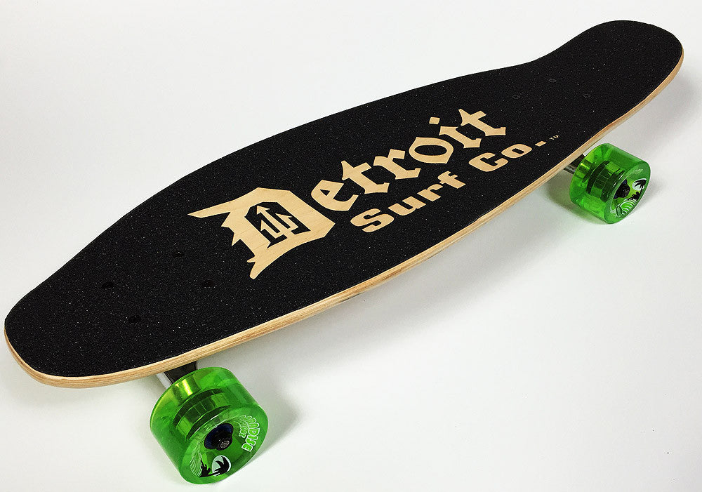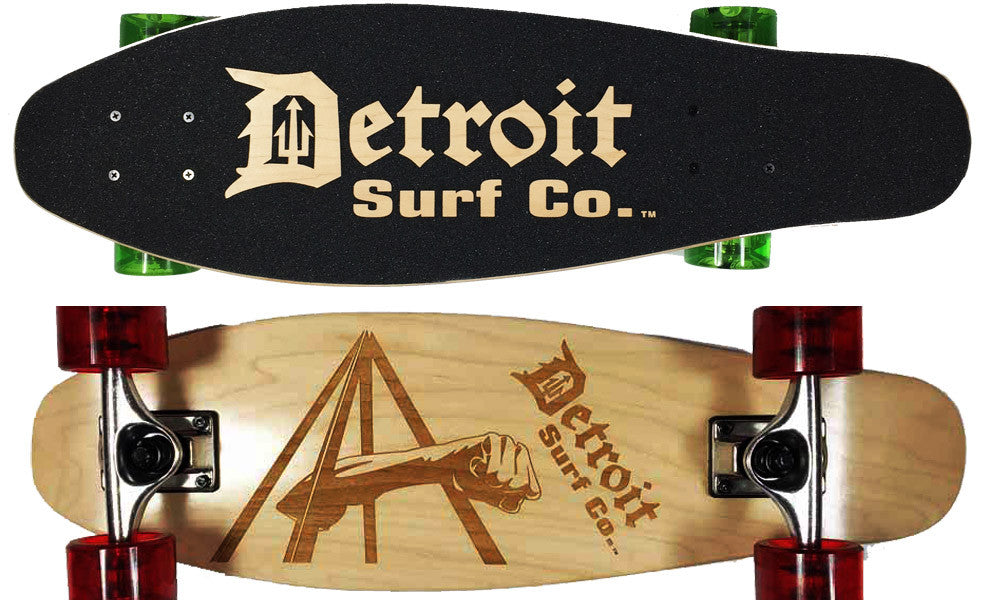 Detroit Surf Co. mini cruiser 26″x 8″ 8 ply hard rock maple, made in USA. Laser Cut Joe Louis Fist in bottom, and die cut logo in deck grip.