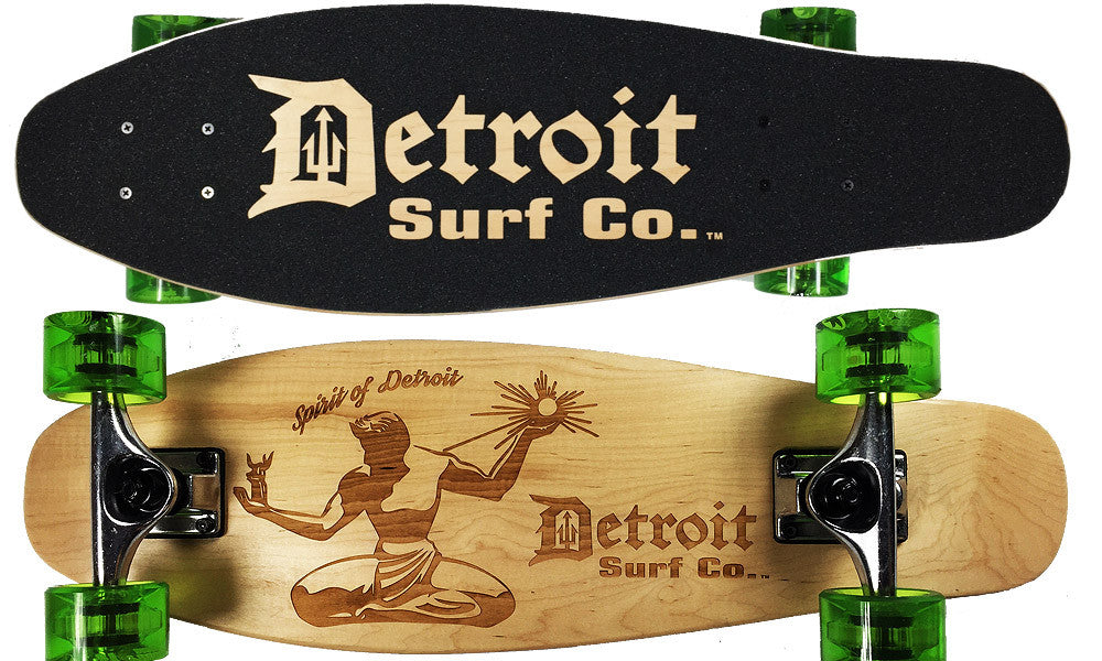 Detroit Surf Co. mini cruiser 26″x 8″ 8 ply hard rock maple, made in USA. Laser Cut Spirit of Detroit in bottom, and die cut logo in deck grip.