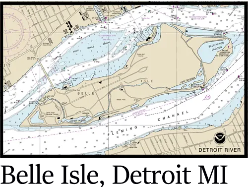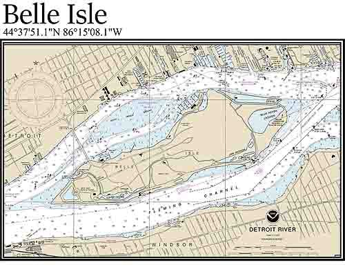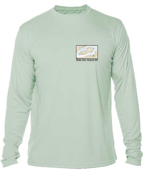 The Back features a navigation chart of the Detroit River at Belle Isle, and a small logo on front left chest. All artwork is applied using dye sublimation, so there is no heavy screen printing on the shirt.