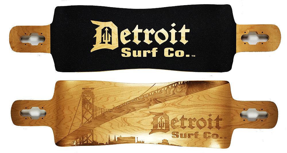 Detroit Surf Co., Corktown, Ambassador Bridge Drop Through version 3 (2016) 40″ x 10″ 8 Ply Hard rock maple deck, with slight concave, made in USA. Laser etched Corktown logo on bottom, and logo cut in top grip tape. DECK ONLY (No Trucks, Wheels, etc)