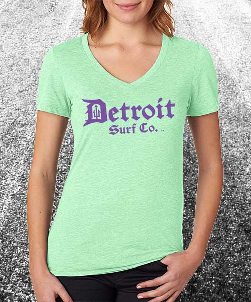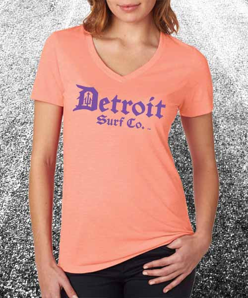 Ladies standard cut V-neck logo T-shirt. Blended shirt, ultra soft, and a not so deep V neck with a vintage textured look. Classic Detroit Surf Co. Purple logo, and small trident D on right rear shoulder. Sizes small – XL, please see size chart below.